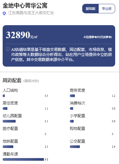 以距離嘉華嘉璟峰僅533米的金地中心菁華公寓項目為例,該項目與嘉璟峰共享著地鐵、商業(yè)和醫(yī)療等基礎(chǔ)配套。每經(jīng)品房小程序顯示,金地中心菁華公寓的估值參考價約為3.29萬元/平方米,在包括人口結(jié)構(gòu)、居住密度、商務(wù)密度等在內(nèi)10項指標(biāo)中,通勤車速得分為9.8分,而其他指標(biāo)得分均低于4分,這在一定程度上反映了該項目周邊人流相對較為稀少,整體居住配套仍處于待完善狀態(tài)。